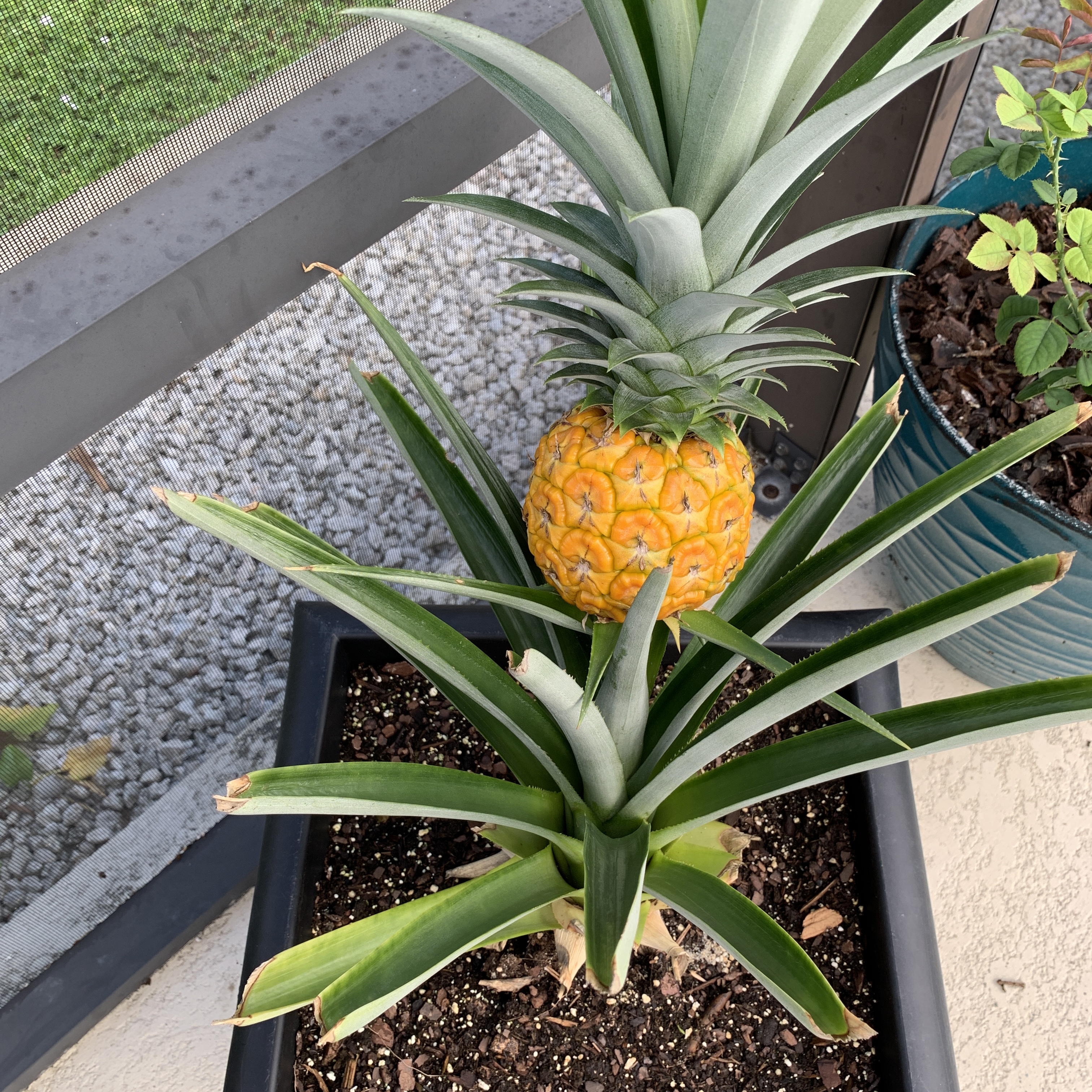 Today our pineapples were the most perfect color of yellow. Time for picking! Take a sharp knife and slice it at the bottom where it connects to the plant. (If you’re concerned about the readiness of any pineapple, whether growing your own or in a grocery store, pull on one of the top leaves. If it pulls out easily, it’s fresh.)